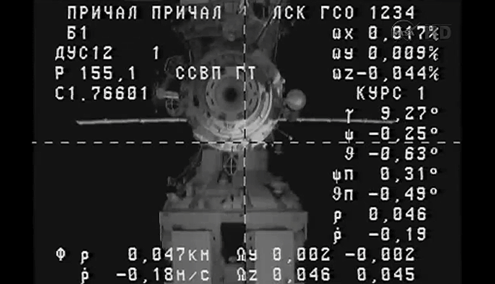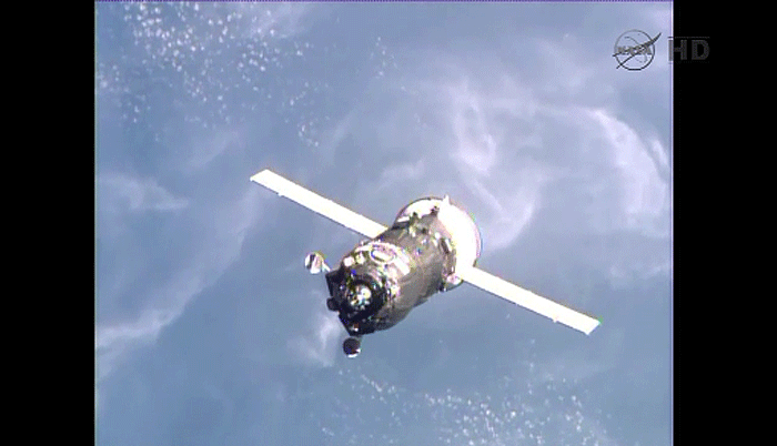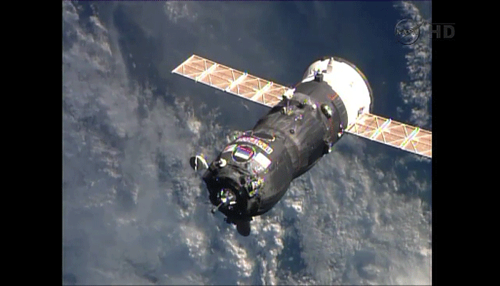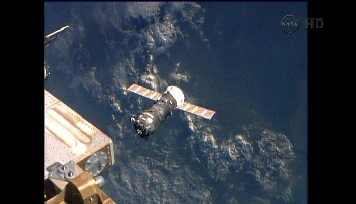 An unmanned Russian cargo spacecraft docked with the International Space Station to deliver supplies to the crewmembers manning the space laboratory after a quick trip through space.