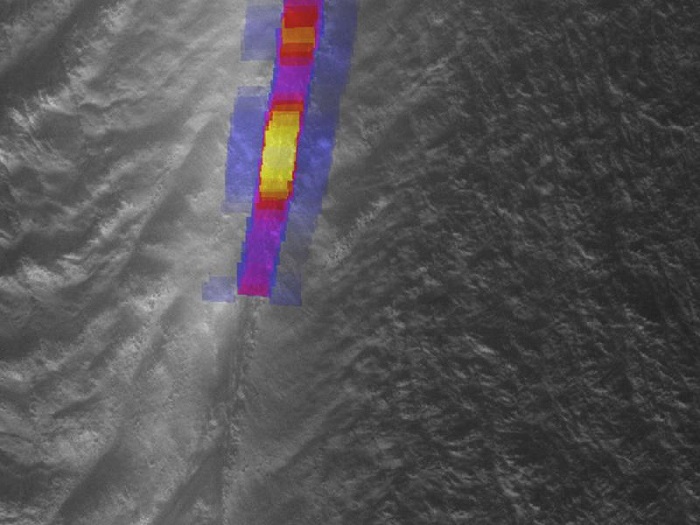 Data from NASA's Cassini spacecraft have enabled scientists to make the highest-resolution heat intensity maps yet for the hottest part of a "tiger stripe" fissure on Saturn's moon Enceladus. The moon's south polar region features several of these long fissures that spray water and icy particles, and the one in this image is called Damascus Sulcus.