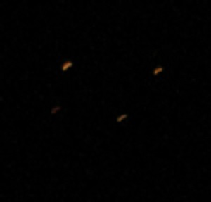 At 0105 on the 31st of March, the witnesses reported seeing something they considered unusual. A yellowish light that was different than plane lights, rose into the sky and slowly became bigger. It divided into two parts and then divided again so that they saw four white lights. At this moment, one of the witnesses, who was a photographer, took two pictures but they were underexposed. The observers report that they saw the front of the object behind the lights for 15 seconds. It was described to be a dark shape with bright lights and some white areas, (which may have been a reflection or other light emission).At this point the photographer took a third picture. According to the photographer, the object occupied about one third of the viewfinder’s field of view (FOV). The object at the time was at an elevation angle of 45° and the three witnesses estimated the altitude of the object as being 300 meter and the size being that of a 747 airliner (about 60 to 70 m). The witnesses added that heard a whistling noise typical of a plane but concluded it was not a plane because it was too weak for the low height of the object.