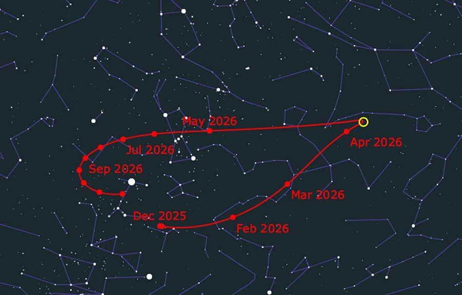Its April 4th perihelion will be a squeaker, with MAPS soaring just 748,000 km (465,000 miles) above the Sun's searing surface — within range of the highest-recorded solar prominences! Officially, it's a sungrazer, a comet that gets within 1.4 million km of the Sun at its nearest approach. Such close shaves often lead to the comet fragmenting due to a combination of extreme heating and strong gravitational tides. However, if the comet survives its joust with the Sun, it may become a bright, naked-eye object.
