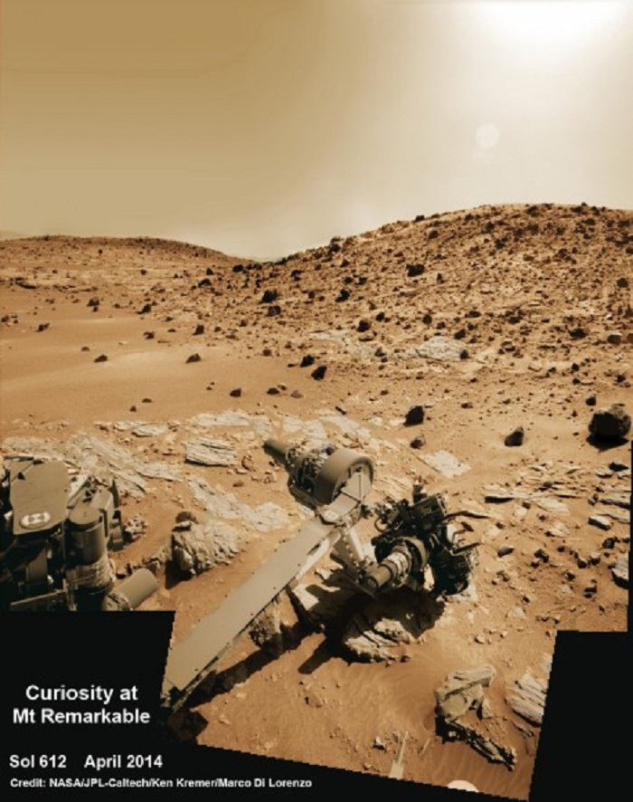 Multisol composite photo mosaic shows deployment of Curiosity’s rovers robotic arm and APXS X-ray spectrometer onto the ‘Winjana’ rock target at Mount Remarkable for evaluation as missions third drill target inside Gale Crater on Mars. The colorized navcam raw images were stitched together from several Martian days up to Sol 612, April 26, 2014. Credit: NASA/JPL-Caltech/Ken Kremer