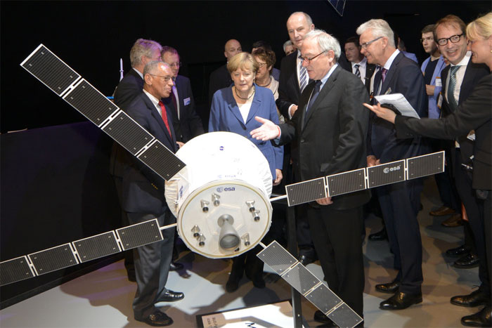 Jean-Jacques Dordain, ESA Director General, presents to the German Chancellor Angela Merkel and to Charles Bolden, NASA Administrator, the ‘Space for Earth’ space pavilion at ILA, the Berlin Air and Space Show, on 20 May 2014.