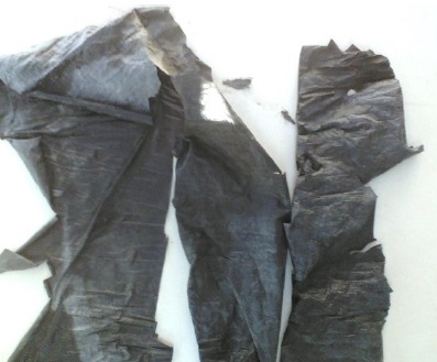 The thing I noticed concerning the samples I received was that there were certain sections of the dark material that retained its elasticity. One part, I could put my finger into and stretch. However, another section tore quite easily. When I put the material up to the sunlight, I noticed that there were two different densities and colors visible (see image lower left). This is all consistent with what both Lance and I experienced in our tests.