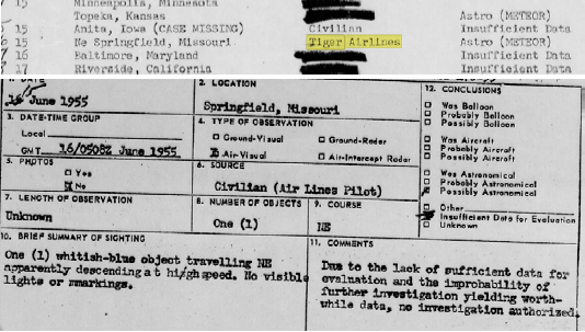 A check of the Blue Book records found some references to what Keyhoe might be referring. The Tiger airlines incident occurred on 15th and was part of a series of sightings that night.18 On the same night there was a bright fireball, which was seen over the midwest