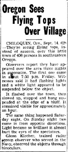 September 11-13, 1953--Chiloquin, Ore. Police Chief, others, watched top-like UFOs three consecutive nights.21