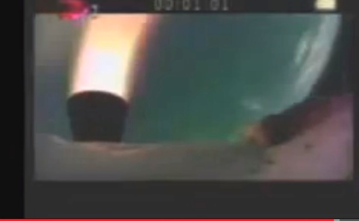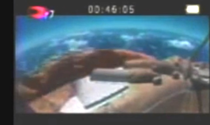 The LDSD test vehicle is unseen at the tip of the slash-like contrail at the upper left of this image. Just to the right of the contrail, and about a third of the way up, is the balloon that carried the saucer.