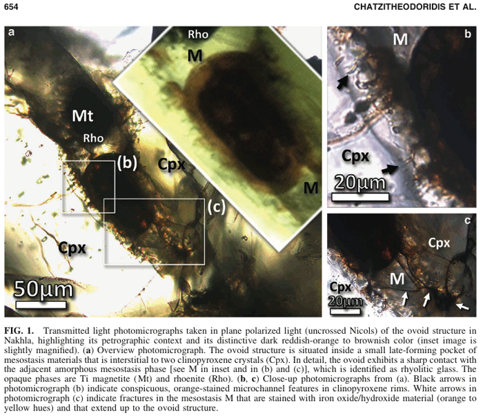 In the article, "A Conspicuous Clay Ovoid in Nakhla: Evidence for Subsurface Hydrothermal Alteration on Mars with Implications for Astrobiology," Elias Chatzitheodoridis, National Technical University of Athens, Greece, and Sarah Haigh and Ian Lyon, the University of Manchester, UK, describe the use of tools including electron microscopy, x-ray, and spectroscopy to analyze the ovoid structure. While the authors do not believe the formation of this structure involved biological materials, that is a possible hypothesis, and they note that evidence exists supporting the presence of niche environments in the Martian subsurface that could support life.