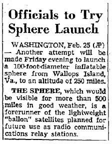 On February 27, 1960, NASA launched, from Wallops island, a 100-foot diameter test of the Echo balloon satellite. The tests from Wallops Island were referred to as “Shotput” tests. This one was launched to an altitude of over 200 miles and was to test the inflation of the balloon and see if it was possible to reflect radio transmissions off of it. The launch was announced ahead of time with the Associated Press (AP) stating it would be visible from a distance of 500 miles or more in good weather.5