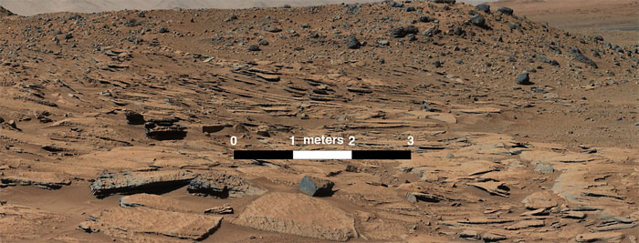 The Mastcam's left-eye camera recorded the component frames of this mosaic on March 25, 2014, during the 580th Martian day, or sol, of Curiosity's work on Mars. The color has been approximately white-balanced to resemble how the scene would appear under daytime lighting conditions on Earth. This version has a superimposed scale bar of 50 centimeters (about 20 inches) in the foreground and a scale bar of 3 meters (about 10 feet) at upper right.