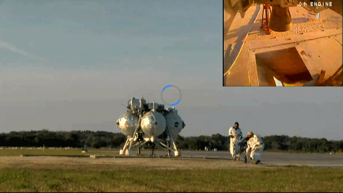 The four-legged Morpheus lander lit its engine at 4:11 p.m. and climbed about 800 feet, then flew forward 1,300 feet while descending to a pad in a simulated moonscape north of the shuttle runway, where it touched down in a cloud of dust.