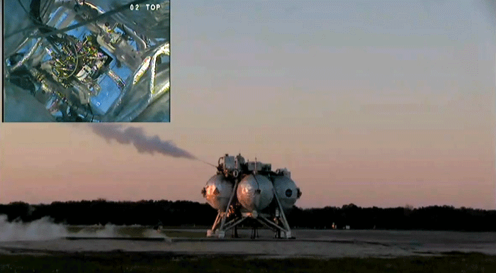 A prototype NASA lander fired its engine today while hanging from a crane at Kennedy Space Center, but the engine quickly cut off.