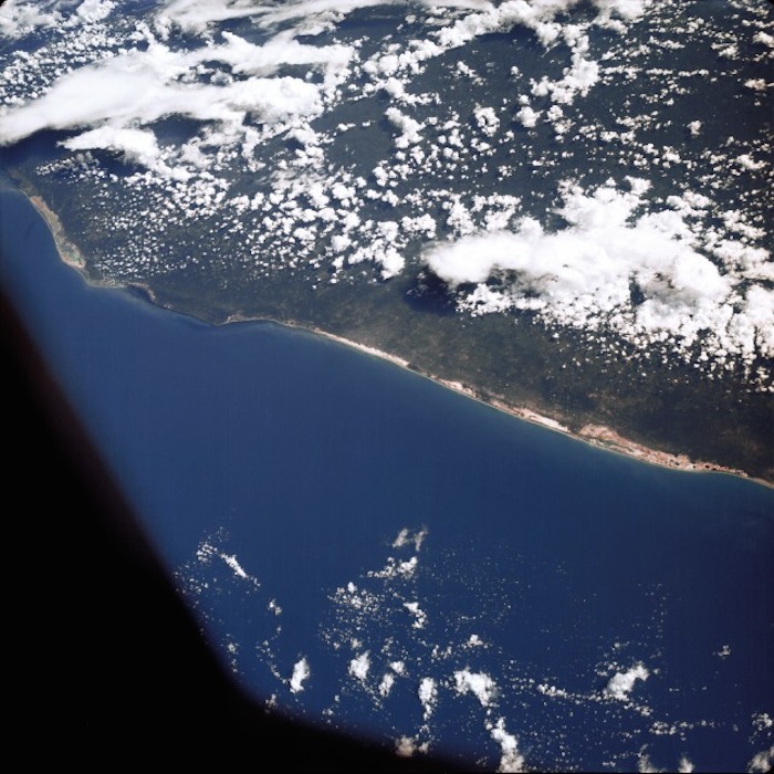 AS07-05-1635 (13 Oct. 1968) --- Gulf of Mexico, coast of Yucatan, Mexico, as seen from the Apollo 7 spacecraft during its 33rd revolution of Earth. Note road leading to city of Merida which is under cloud cover. Photographed from an altitude of 123 nautical miles, at ground elapsed time of 52 hours and 37 minutes.