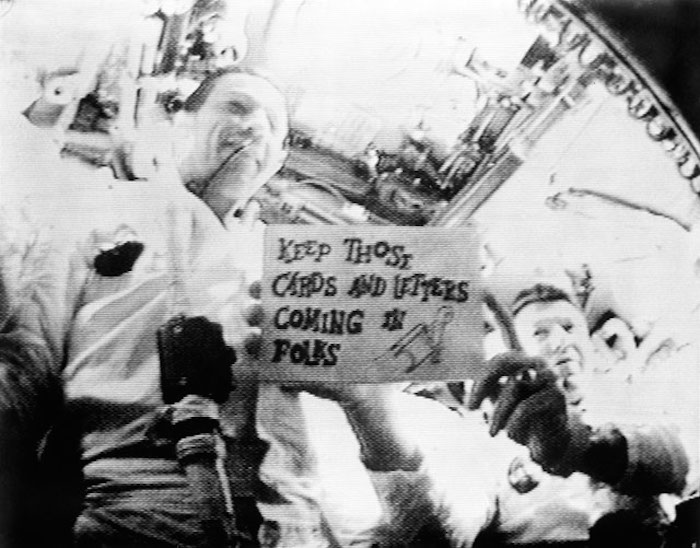 S68-50713 (14 Oct. 1968) --- Astronauts Walter M. Schirra Jr. (on right), mission commander; and Donn F. Eisele, command module pilot; are seen in the first live television transmission from space. Schirra is holding a sign which reads, "Keep those cards and letters coming in, folks!" Out of view at left is astronaut Walter Cunningham, lunar module pilot.