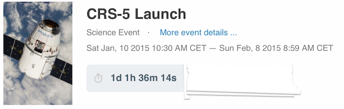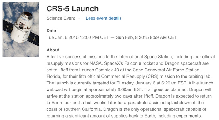 A Saturday launch will result in the Dragon spacecraft arriving at the space station Monday, Jan. 12. Expedition 42 Commander Barry "Butch" Wilmore of NASA will use the station's 57.7-foot robotic arm to capture Dragon at approximately 6 a.m. Flight Engineer Samantha Cristoforetti of the European Space Agency will support Wilmore as they operate from the station's cupola. NASA TV coverage of grapple will begin at 4:30 a.m. Coverage of Dragon's installation to the Earth-facing port of the Harmony module will begin at 8:15 a.m.