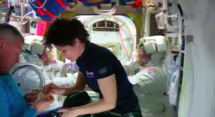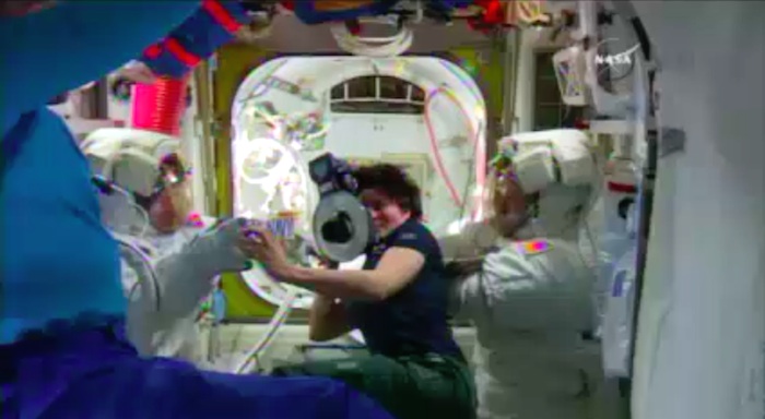 Left to Right: NASA astronaut Terry Virts, Italian astronaut Samantha Cristoforetti and cosmonaut Anton Shkaplerov inspect Virts' spacesuit helmet after it leaked a small amount of water during a spacewalk Wednesday, Feb. 25, 2015. (PHOTO/NASA TV)