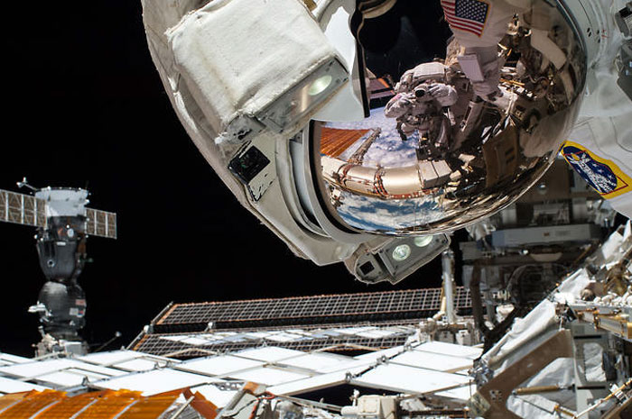 Left to Right: NASA astronaut Terry Virts, Italian astronaut Samantha Cristoforetti and cosmonaut Anton Shkaplerov inspect Virts' spacesuit helmet after it leaked a small amount of water during a spacewalk Wednesday, Feb. 25, 2015. (PHOTO/NASA TV)