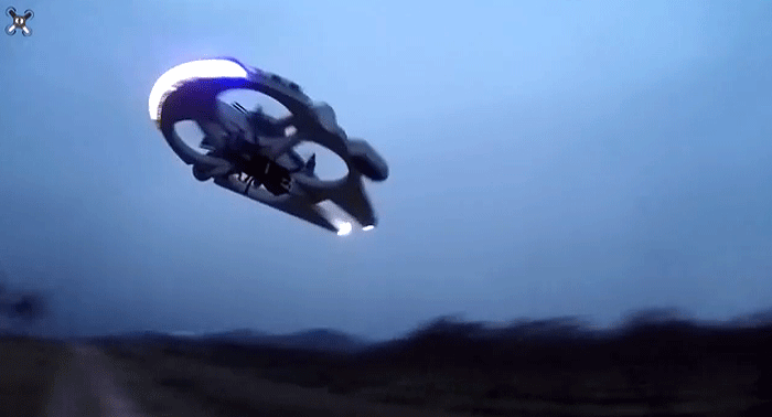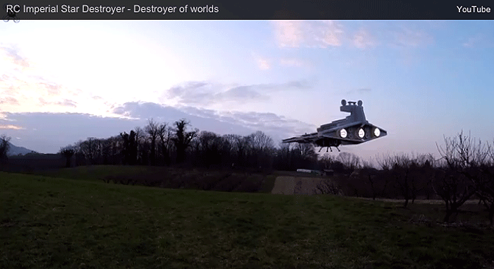 French drone hobbyist Olivier C is building a drone navy. It started with a Millenium Falcon drone, then followed by a TIE Interceptor drone. Now, Olivier C has moved beyond smugglers and starfighters to deliver a capital ship: an Imperial Star Destroyer. Like his previous Star Wars drones, the Star Destroyer is a foam body built on top of a custom quadcopter chassis, and there are giant circular holes in the Star Destroyer's shape to accommodate the quadcopter’s spinning rotors.