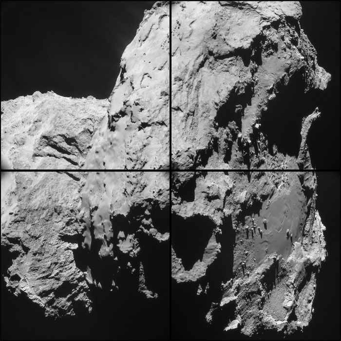 Four image montage of images taken by Rosetta’s NAVCAM from an average distance of 31.3 km from the comet centre. The scale at this distance is 2.7 m/pixel and the size of each 1024 x 1024 pixel frame is 2.7 km. Credits: ESA/Rosetta/NAVCAM – CC BY-SA IGO 3.0