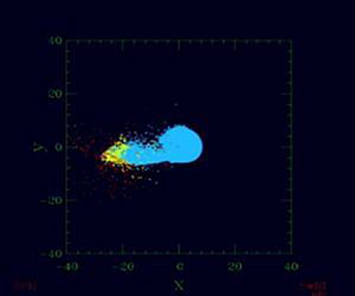 One possible realization of the Moon-forming impact event is animated. Here it is assumed that a Mars-sized protoplanet, defined as having 13 percent of an Earth-mass, struck the proto-Earth at a 45-degree angle near the mutual escape velocity of both worlds. The "red" particles, comprising 0.3 percent of an Earth-mass, were found to escape the Earth-Moon system. Some of this debris may eventually go on to strike other solar system bodies like large main belt asteroids. "Yellow-green" particles go into the disk that makes the Moon. "Blue" particles were accreted by the proto-Earth. The details of this simulation can be found in Canup, R. (2004, Simulations of a late lunar-forming impact, Icarus 168, 433-456). Image courtesy Robin Canup, Southwest Research Institute. Watch an animation on the research