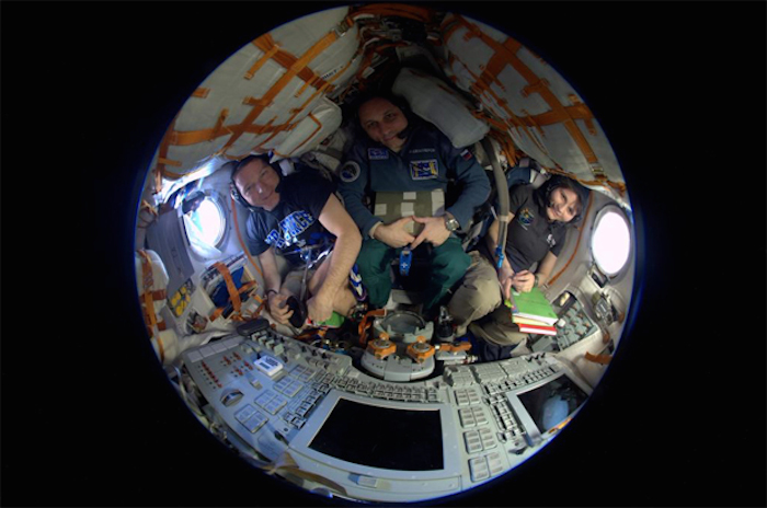 The Soyuz TMA-15M crew, reviewing entry procedures in their descent module before returning to Earth on Thursday. Left to right: NASA astronaut Terry Virts, spacecraft commander Anton Shkaplerov and European Space Agency astronaut Samantha Cristoforetti. NASA