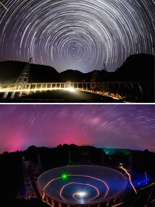 Combined photo shows picture of night view of the Five-hundred-meter Aperture Spherical Telescope (FAST) at a karst valley in Pingtang County of southwest China's Guizhou Province taken on Sept. 1, 2014 (up) (Photo provided by the National Astronomical Observatories of Chinese Academy of Sciences) and picture of the nearly-done project of FAST taken on June 27, 2016 (Photo by Xinhua photojournalist Ou Dongqu). Installation was completed on the world's largest radio telescope on Sunday morning as the last of 4,450 panels was fitted into the center of the big dish. Scientists will then begin debugging and trial observation of the FAST. The project has the potential to search for more strange objects to better understand the origin of the universe and boost the global hunt for extraterrestrial life. (Xinhua)