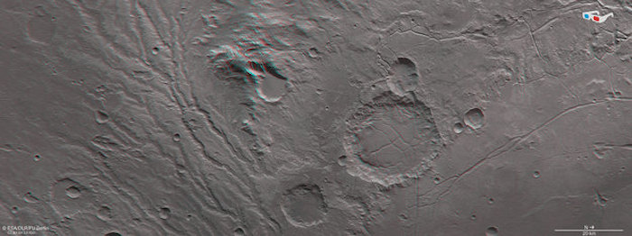 In the upper centre of the main image – also clearly identified in the topography and anaglyph images – a large mound is seen with an 8.5 km-wide impact crater at its foot. The mound is possibly the remnant of an older impact basin but may also have been influenced by sediments transported by the surrounding streams, building up a fan deposit.