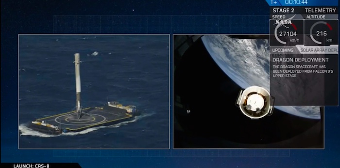 Erfolgreiche Landung der ersten Stufe und gleichzeitiger Seperation von Dragon-CRS-8