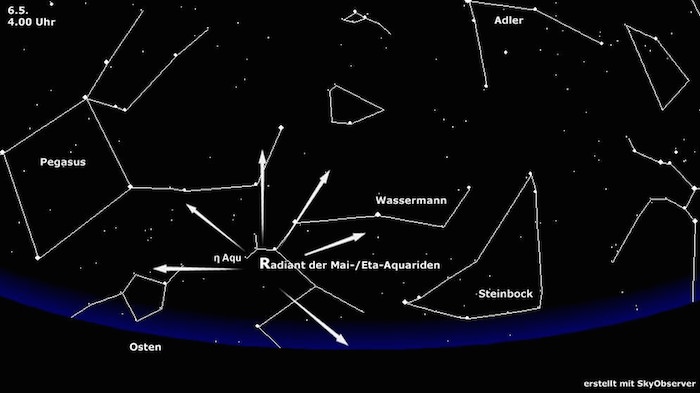 Dann ist der Ausstrahlungspunkt im Wassermann gerade mal eine Handbreit über den Horizont geklettert. Auf der Höhe werden Sie nur etwa ein Fünftel der Sternschnuppen sehen, die tatsächlich unterwegs sind. Das sind aber immerhin trotzdem noch zehn bis fünfzehn Schnuppen in der Stunde. In diesem Jahr lohnt es sich besonders: In den ersten Mainächten stört die abnehmende Mondsichel noch etwas, die morgens vor dem Wassermann im Osten erscheint. Doch am 6. Mai ist Neumond - ungetrübtes Sternschnuppen-Vergnügen.
