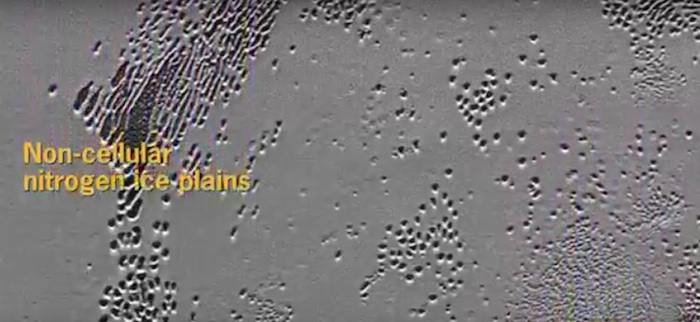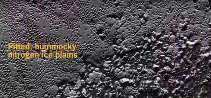 This movie moves down the mosaic from top to bottom, offering new views of many of Pluto’s distinct landscapes along the way. Starting with hummocky, cratered uplands at top, the view crosses over parallel ridges of “washboard” terrain, chaotic and angular mountain ranges, cellular plains, coarsely “pitted” areas of sublimating nitrogen ice, zones of thin nitrogen ice draped over the topography below, and dark mountainous highlands scarred by deep pits.