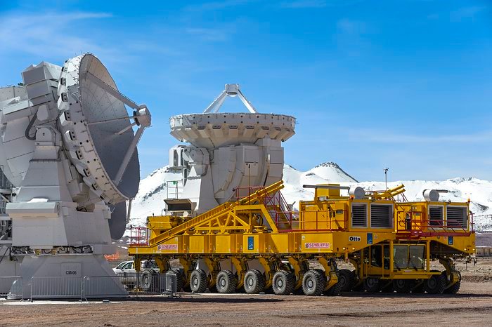 Otto — one of two 22-wheeled ALMA transporters — repositions one of the twelve 7-metre ALMA antennae atop the Chajnantor Plateau in this scene from the Atacama Desert in northern Chile.