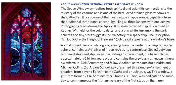 Washington National Cathedral is a historic landmark symbolizing the role of faith in America, and its iconography tells the stories that have shaped the nation's identity. Armstrong, along with fellow astronauts Buzz Aldrin and Michael Collins, presented the National Cathedral with a moon rock brought back during their Apollo 11 mission. The presentation took place in a July 21, 1974 service commemorating the fifth anniversary of the first lunar landing. The iconic Space Window that later would display the sliver of lunar rock also was dedicated at that service.
