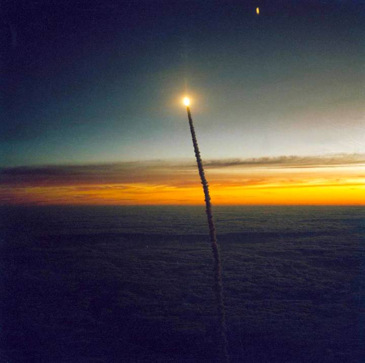 A Florida dawn scene on Oct. 5, 1984 forms the backdrop for the climbing Space Shuttle Challenger, its two solid rocket boosters and external fuel tank, launched on the eight-day STS-41G mission. The scene was photographed by astronaut Paul J. Weitz, who was piloting the Shuttle training aircraft (STA).