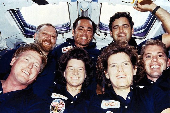 Image above: STS-41G Crew photo with Commander Robert L. Crippen, Pilot Jon A. McBride, Mission Specialists Kathryn D. Sullivan, Sally K. Ride, David C. Leestma and Payload Specialists Marc Garneau and Paul D. Scully-Power. Image Credit: NASA