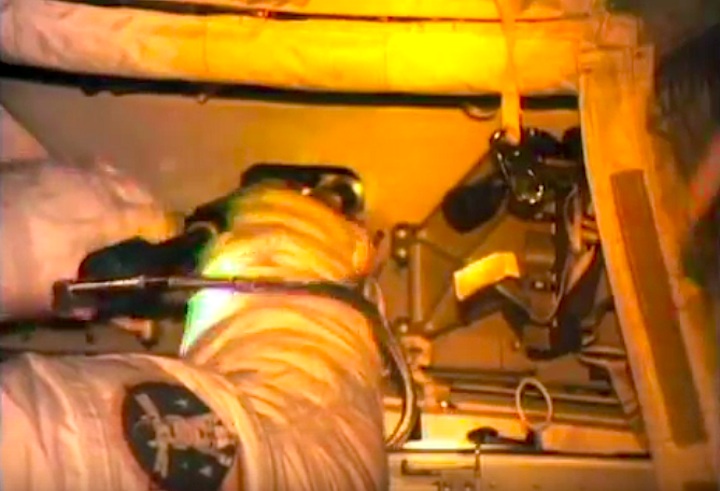 In this image taken on Oct. 13, 1984 aboard Space Shuttle Challenger on mission STS-41G, astronauts Kathryn D. Sullivan, left, and Sally K. Ride show off what appears to be a "bag of worms", a product of their creativity. The "bag" is a sleep restraint and the majority of the "worms" are springs and clips used with the sleep restraint in its normal application. Clamps, a bungee cord and Velcro strips are other recognizable items in the creation.