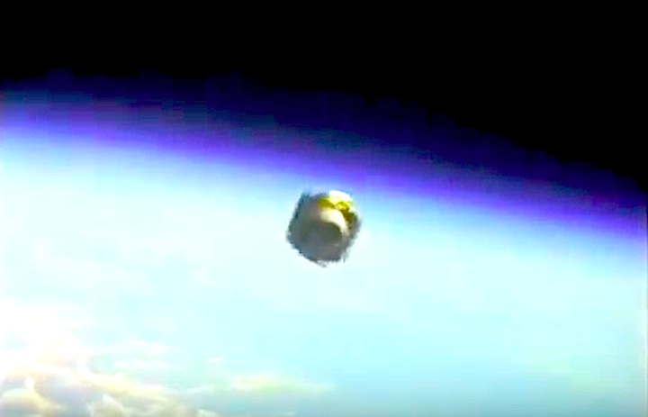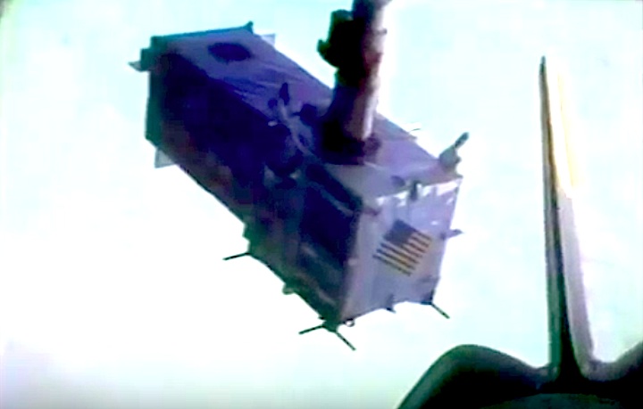 The SPARTAN observatory, pictured affixed to Discovery’s Remote Manipulator System (RMS) mechanical arm. Photo Credit: NASA