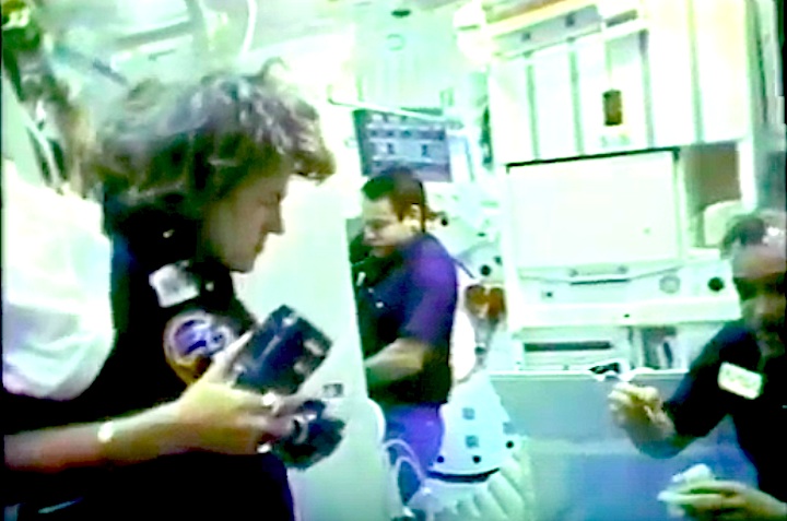 Astronaut Shannon Lucid monitors payload bay activities