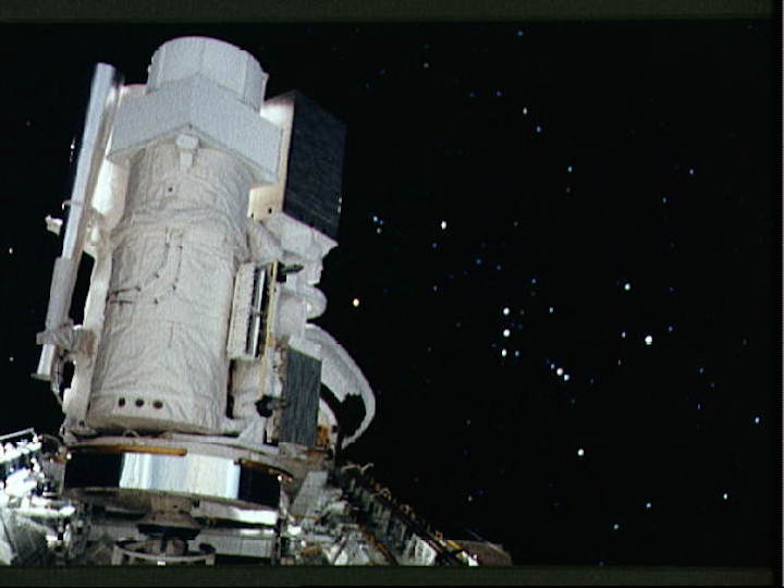 Explanation: In December of 1990, the Space Shuttle Columbia carried an array of astronomical telescopes high above the Earth's obscuring atmosphere to observe the Universe at ultraviolet and x-ray wavelengths. The telescopes, known by the acronyms UIT, HUT, WUPPE, and BBXRT, are seen here in Columbia's payload bay against a spectacular view of the constellation Orion. The ultraviolet telescopes were mounted on a common structure - HUT is visible in this view along with a star tracker (the silver cone at the left). The mission studied solar system, galactic, and extra-galactic sources.