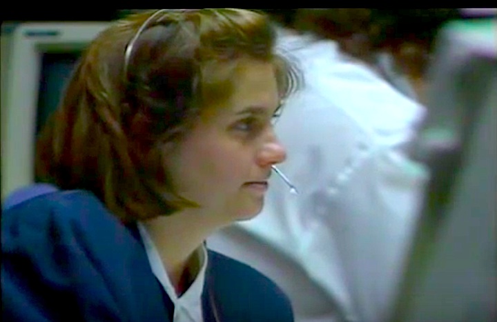 MS Robert Parker manually points ASTRO-1's instruments using a toggle on the aft flight deck.