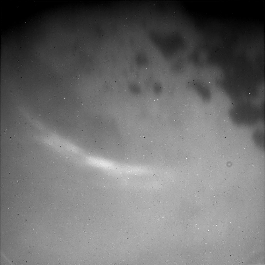 Raw image view of Titan taken by Cassini on June 9 2017. Wisps of methane clouds can be seen hovering over the surface, with some of the north polar lakes and seas in the upper-right. Photo Credit: NASA/JPL-Caltech/Space Science Institute