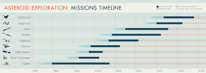 The mission has company in the asteroid sample collection game: the Japanese Space Agency's Hayabusa 2 launched in December 2014. Hayabusa 2 will arrive at its destination asteroid 162173 Ryugu in July 2018, and the sample return will arrive back at Earth in December 2020.